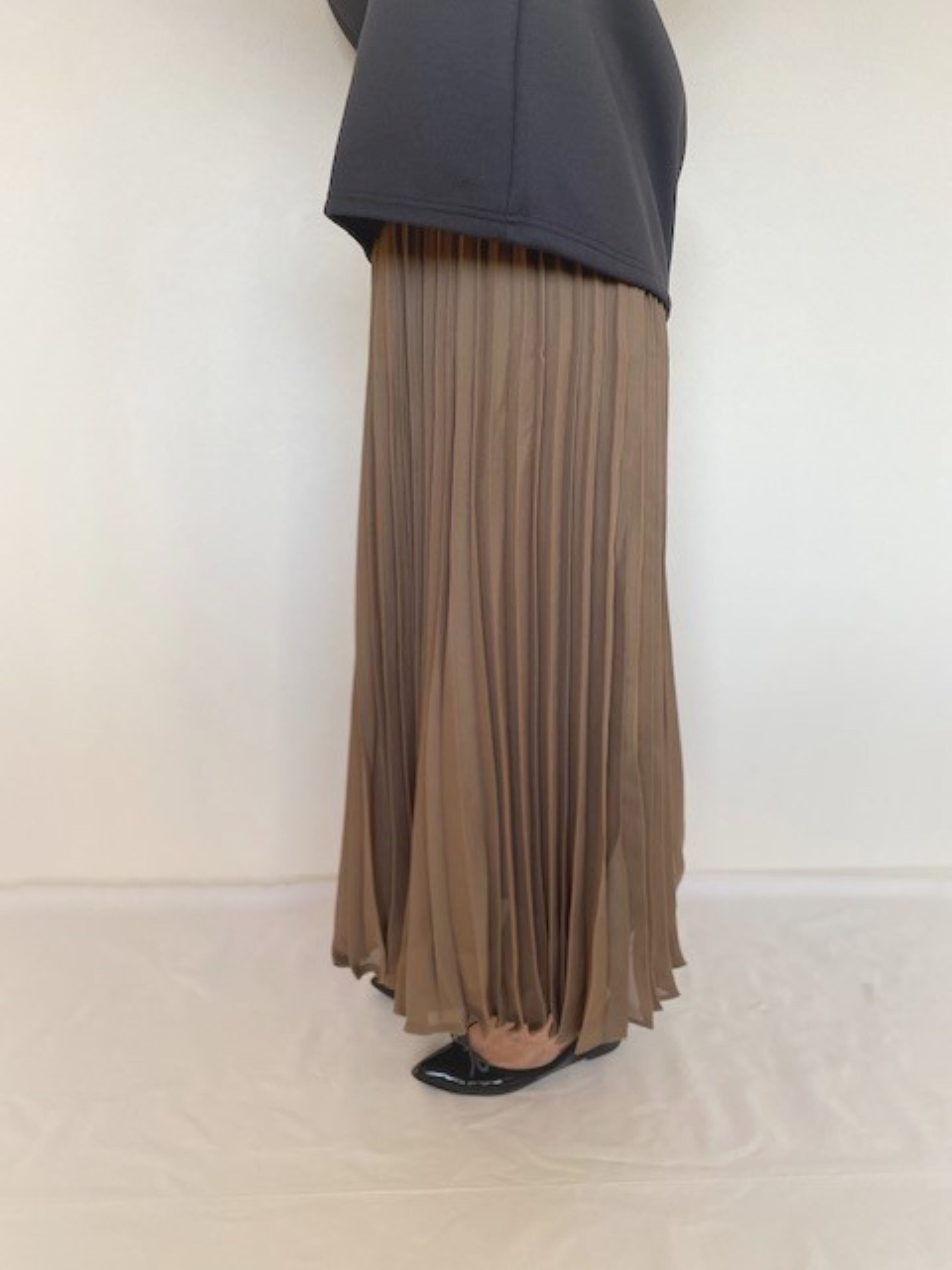 上品な光沢感のある生地をプリーツ加工したプリーツスカート。