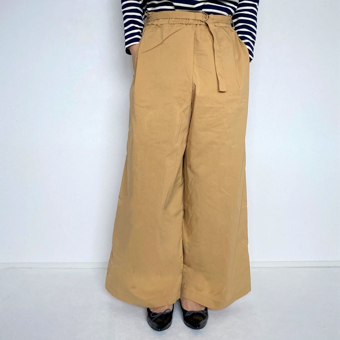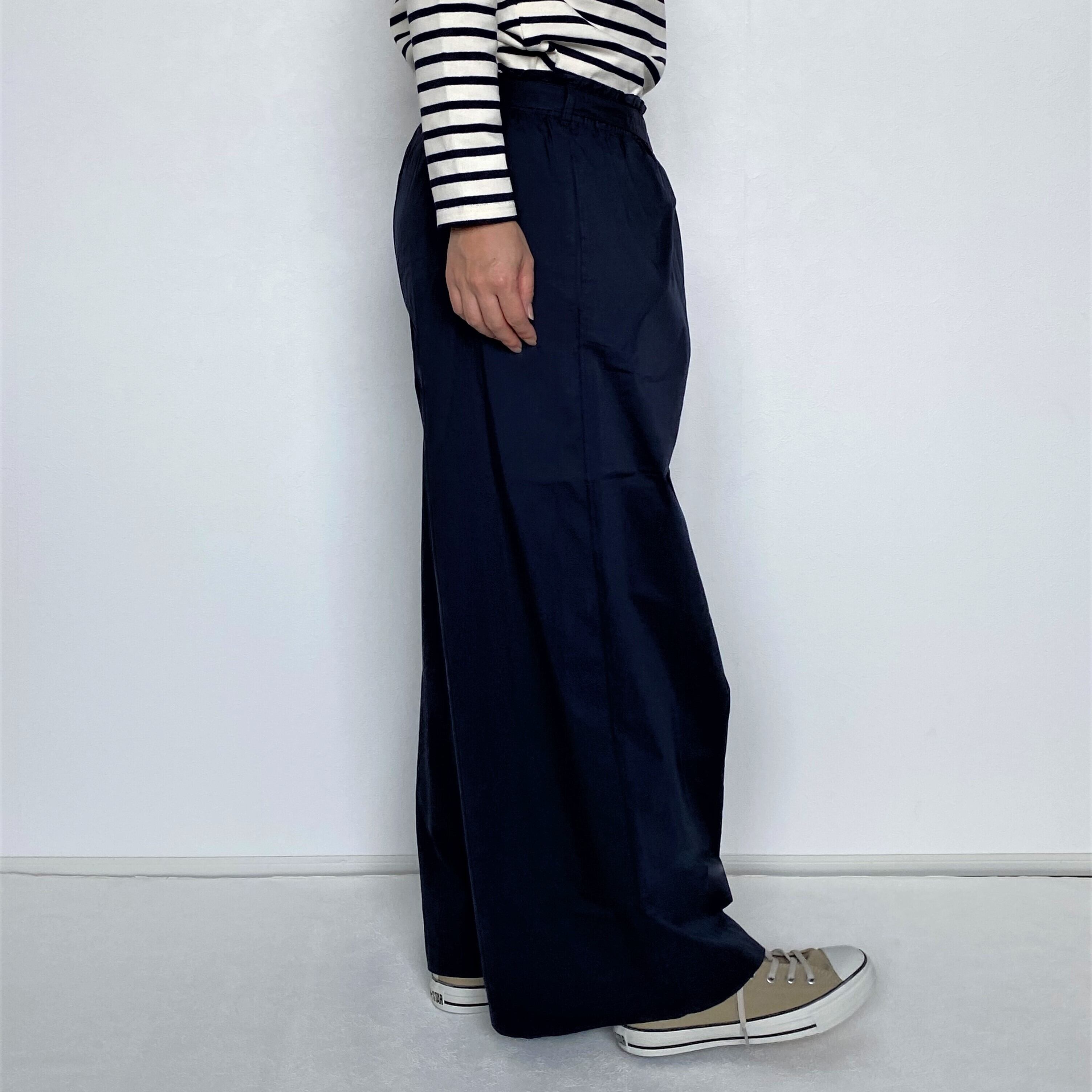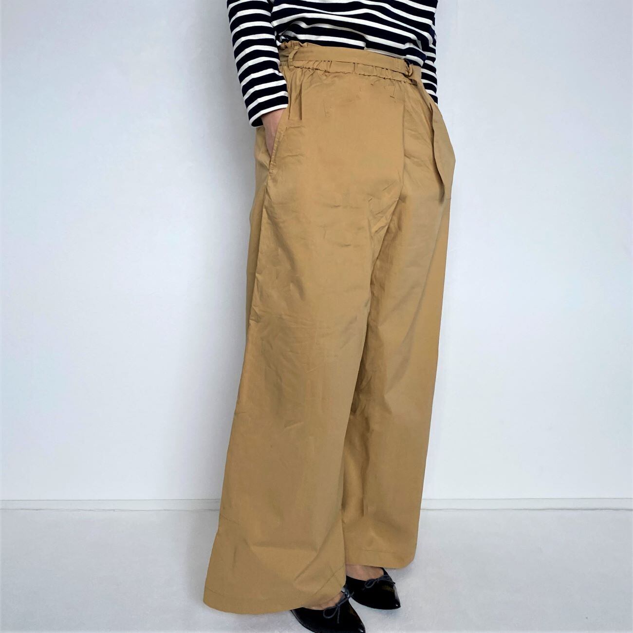 ウエストに大きめのタックを取ったデザインがお腹周りをすっきり見せ着やせ効果があります。