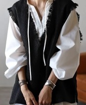 長めのフリンジが存在感抜群。ざっくり深Vツイードベスト